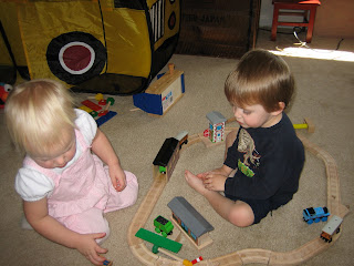 This morning, I became inspired to start potty training Caleb and Geoffrey. I put both of them in big boy underwear and hoped for a good day. Caleb was back in a diaper by 10:06 AM. After about 10 accidents, it became clear that Caleb had no intention of going pee pee in the potty. He would just go wherever he was, and then come tell me about it. He would say "pee pee, floor, right there, right there." He wasn't even upset about it. He just expected me to clean it up. He would say, "bye bye pee pee" after I cleaned up each spot.